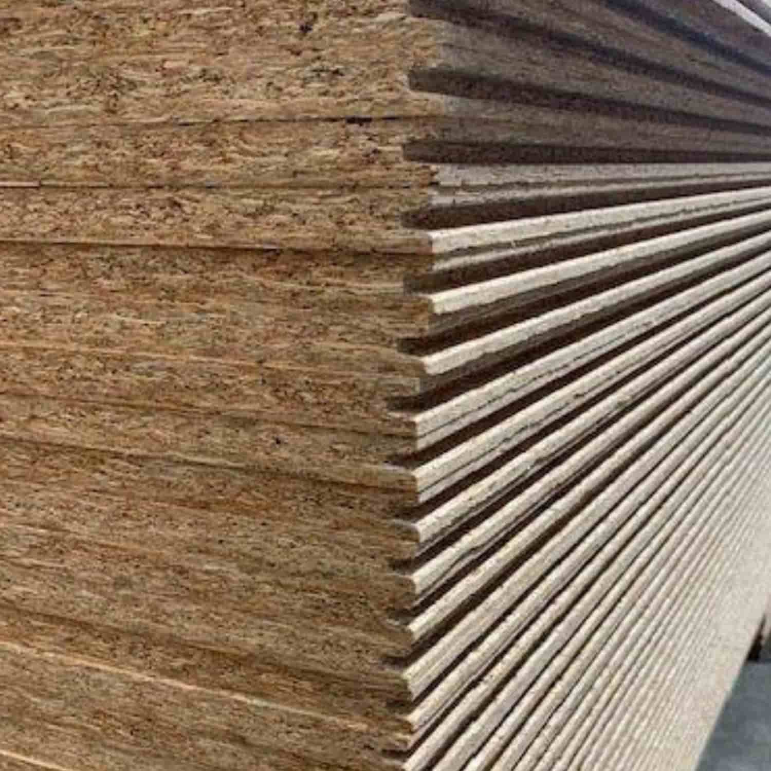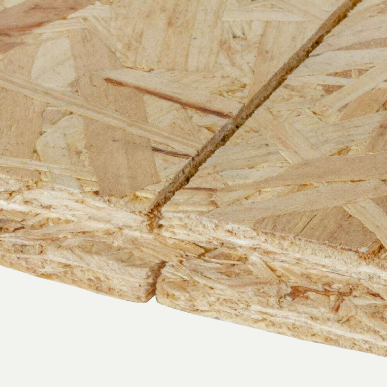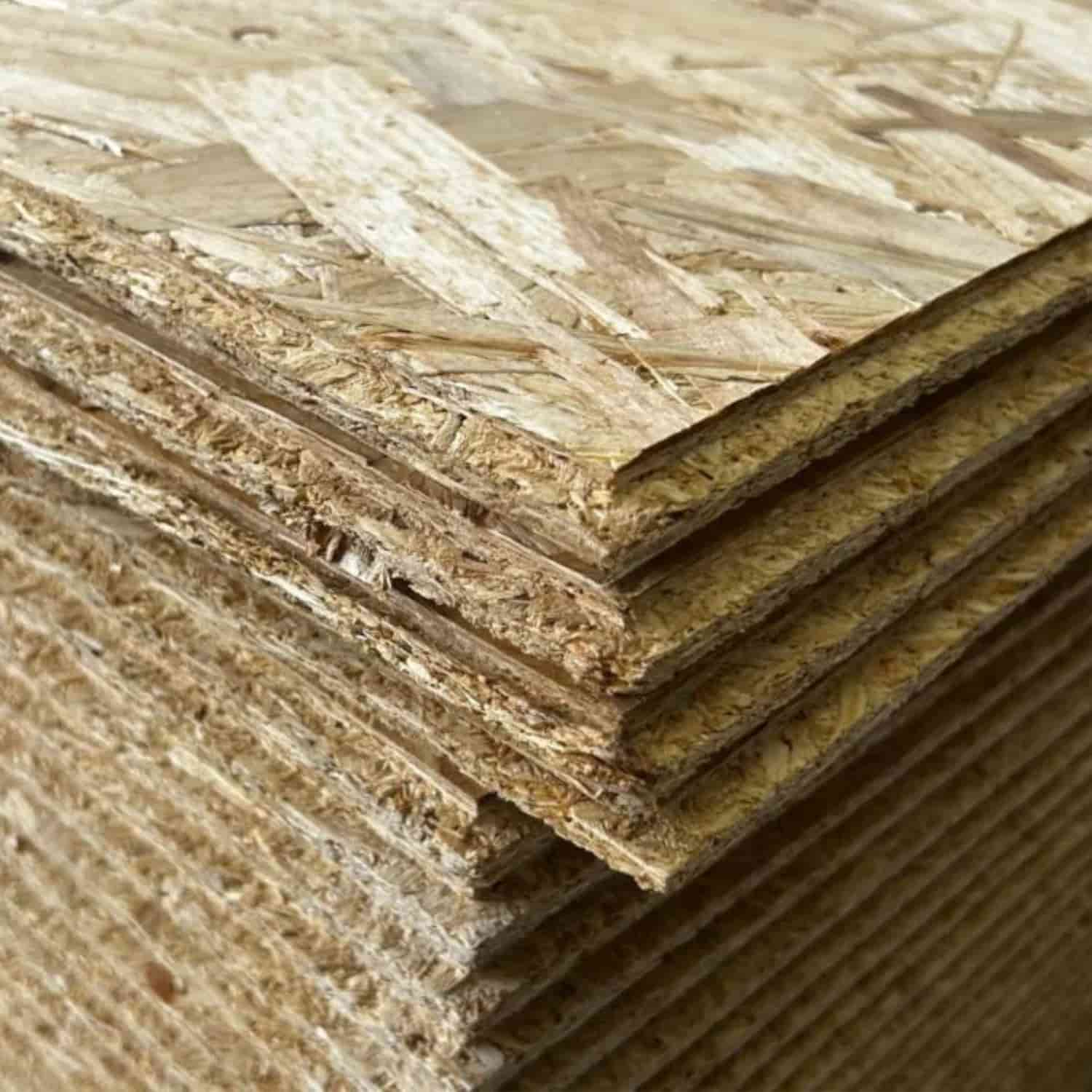 OSB is manufactured from compressed wood strands bonded with resin and wax, producing a strong engineered panel suitable for structural applications.